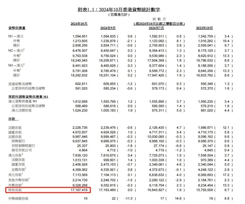 香港金融管理局2024年10月数据