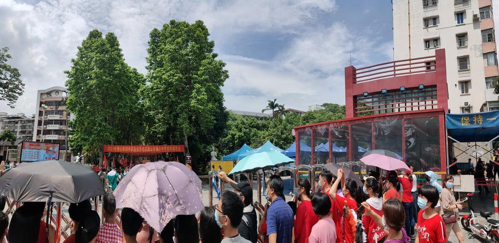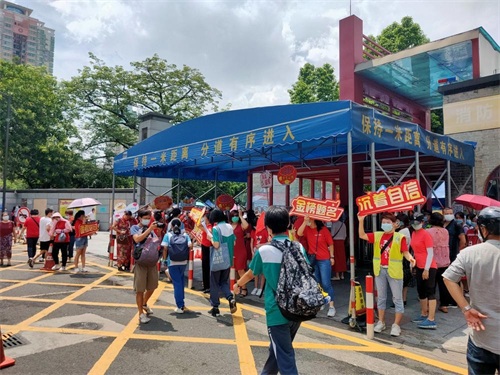 26日下午,作为考点学校,今年佛山三中初中部承担着来自本校、佛山十中、佛山十一中三所学校共1133名考生的考试服务任务。该校共设44个考场(其中普通考场38个,特殊考场1个,备用考场5个)。考试期间,考场门口设立体温监测专用通道,对考生逐一进行体温监测,体温超过37.3℃监视器将亮灯、并发出蜂鸣响声,医护将对考生进行复测,若仍然超标,考生将在值班室留置,直到体温正常才能进考场。