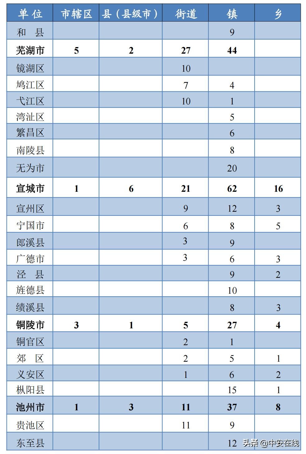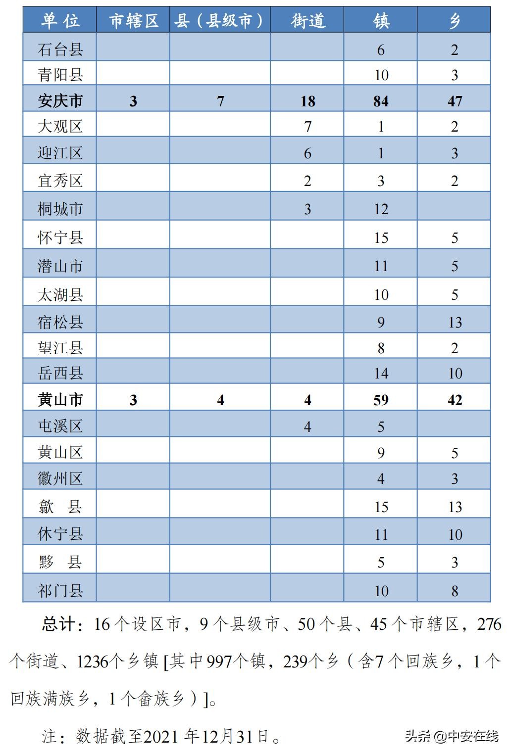 截至2021年12月31日,安徽有16个设区市、9个县级市、50个县、45个市辖区、276个街道、1236个乡镇[其中997个镇,239个乡(含7个回族乡,1个回族满族乡,1个畲族乡)]