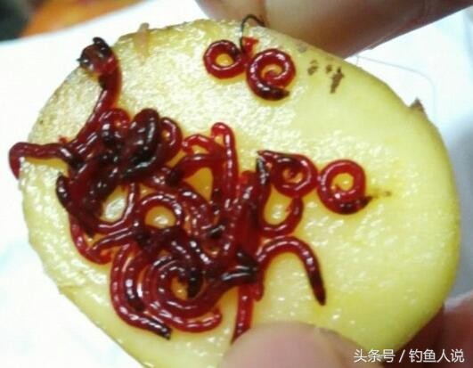 最后,直接用鱼钩扎土豆片上的红虫即可完成挂钩动作。