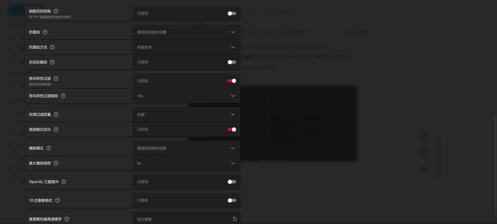 各异项过滤【开启】:牺牲性能提高纹理质量,但性能影响很小建议开高。