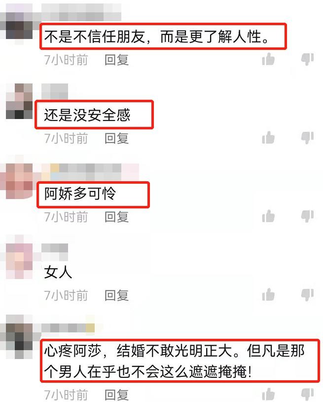 但也有不少网友表示对她很心疼,结婚也没有朋友祝福,感觉阿Sa当年和郑中基在一起受了很多委屈。也有网友猜测连在朋友面前都隐瞒,可见这场婚姻一开始就潜伏了很多问题。倒是阿Sa再次提及之前的那段婚姻,在最后依旧笑着对大家说还是很浪漫的,可见那段婚姻对于阿Sa来说也是一段幸福的时光。