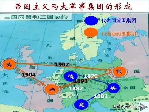 协约国:与此同时,法国与俄国与1894年正式结成联盟;英国与法国两国得意1904年正式签署《英法协约》。此外,俄国对德国皇帝威廉在巴尔干半岛上支持奥匈帝国的态度相当恼火,故此决定结束与英国在中亚问题上的长期纠纷,进而与之家结盟。1907年英、法、俄三国之间协约正式达成。