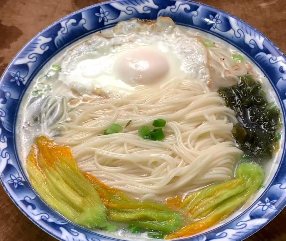 将面汤盛入碗中,激发出紫菜虾皮的鲜味,放入煮好的面条,煎好的鸡蛋,根据个人口味可以放入自己喜欢吃的蔬菜,再来一点的身份的象征,榨菜在我们这种面条称之为清汤面,这种面条儿把懒字发挥到了极致。