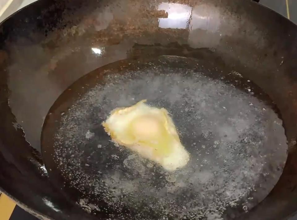 接下来开始煮面,锅中放入一点点油,油热以后单手打入一个鸡蛋,鸡蛋放进去以后,先不要惊动他,带去慢慢进行,加入适量的清水,将水烧至底部冒小泡时放入面条,不要等到开锅再放,这样煮熟的面条才筋道爽滑,而且可以使面条儿更能快速的成熟,