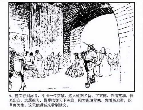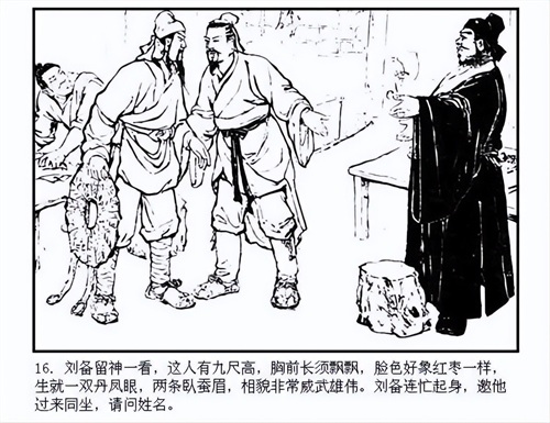 故事发生在东汉灵帝年间,刘备因家道中落,以卖草鞋和草席为生。他心怀大志,希望恢复汉室江山。在一次偶然的机会中,刘备结识了豪杰关羽和张飞。关羽因杀了恶霸而逃亡,张飞则是一位家财万贯的屠夫。三人一见如故,志趣相投,都渴望为国家效力,扫除奸佞。