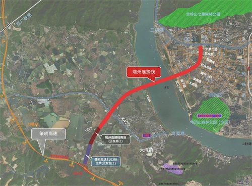 肇明高速端州连接线将加强肇明高速与肇庆城区的联系,方便端州区西部群众出行。该路线整体呈东北—西南走向,起点位于肇庆大道(G321),在市政道路上向西南设高架桥依次跨越智慧路、端州路、棠美路、大鼎路、滨江大道、X429等10条路,经大湾镇终点接大湾互通收费站管理中心,初测路线长度约为6.614公里。全线共设桥梁2座(含西江特大桥)、互通式立交2处。