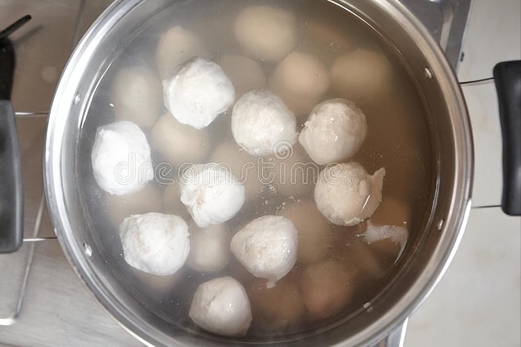 4、锅子中添上足量的冷水,然后把鱼糜团成一个个的小丸子,下入冷水锅中。等所有丸子都放进去后,就可以开火煮了,大火煮开了之后,再继续煮上1分钟的时间,丸子就熟了。