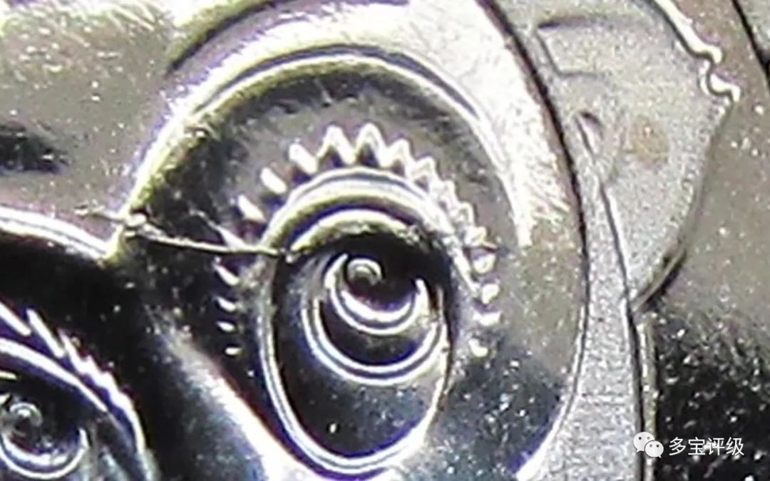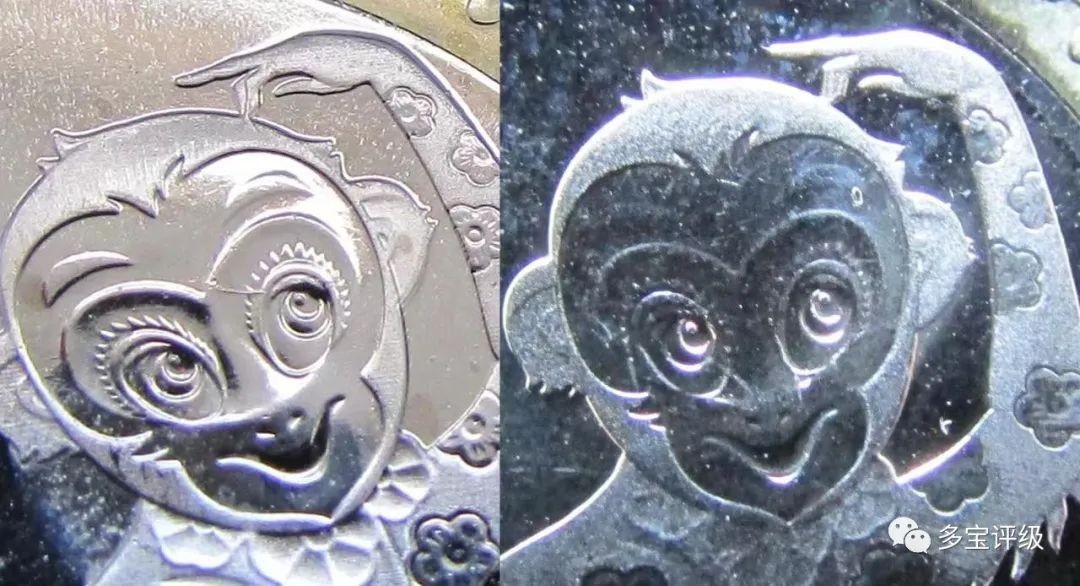 二、眼部带有凸起线条的猴币。猴币背面主景图案猴子左眼从印堂至上眼皮之间,有一条凸起的不规则线条,与上眼皮汇合后至后眼角。从特征上看,这一特征不在设计图稿之内,应为纪念币制作过程中形成的瑕疵。这一现象在第一批次的猴币中也存在,微友称其为“凸眉猴”。也有人当做错版炒作,笔者认为这不是错版币,充其量算是趣味币,实质上它就是一枚不折不扣的瑕疵币。