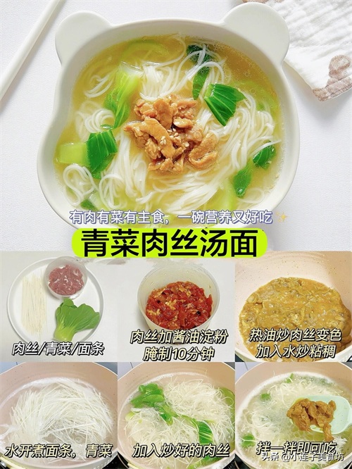 清新的青菜搭配嫩滑的肉丝,一碗汤面尽显食材原汁原味。青菜中的膳食纤维有助于消化,而肉丝则提供了必要的脂肪和蛋白质。