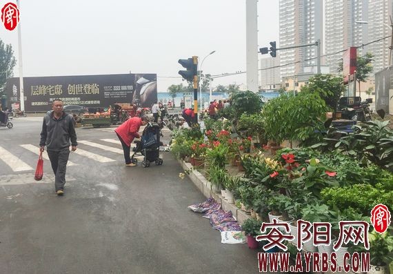 当日10时许,记者来到现场,在人民大道与朝霞路交叉口西北角与东北角,远远就能看到路口拐弯处被小商贩占据。卖植物的、卖服装的、卖水果的、卖蔬菜的……每个摊位前都有买东西的人,他们与过马路的行人和车辆相互交错,十分混乱。一些骑电动三轮车摆摊的商贩还向过路的司机、路人叫卖橘子、柿子等,而电动三轮车所在的路面上全是烂水果和塑料袋等垃圾。