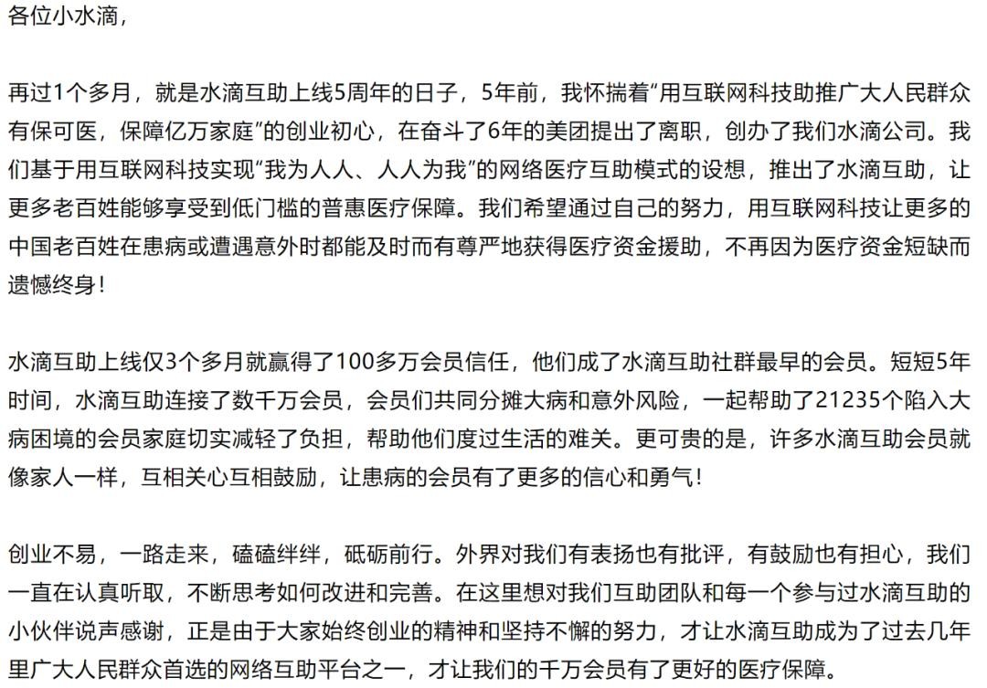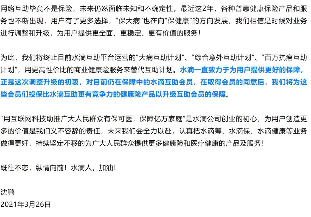 附:沈鹏致水滴全员公开信:水滴互助服务模式升级,为用户提供更好的保障