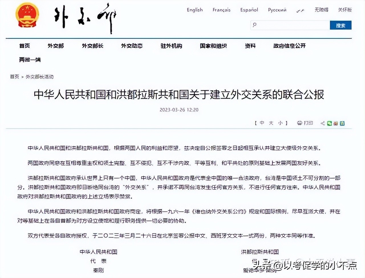 3月26日 12:45 中洪建交联合公报公布
