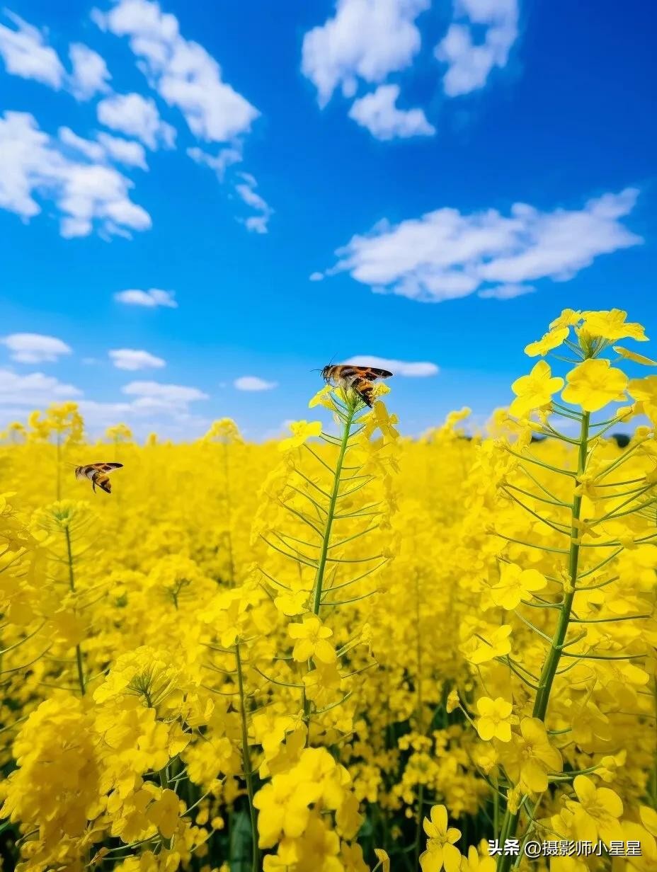 蜜蜂等昆虫在油菜花中的飞舞和活动,可以为照片增加动感和互动感。它们的忙碌和活跃能够让照片更加生动有趣,并营造出一种自然和谐的氛围。