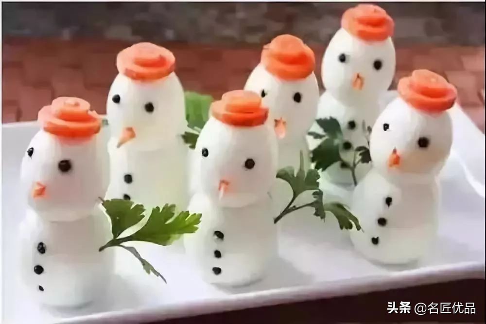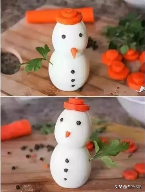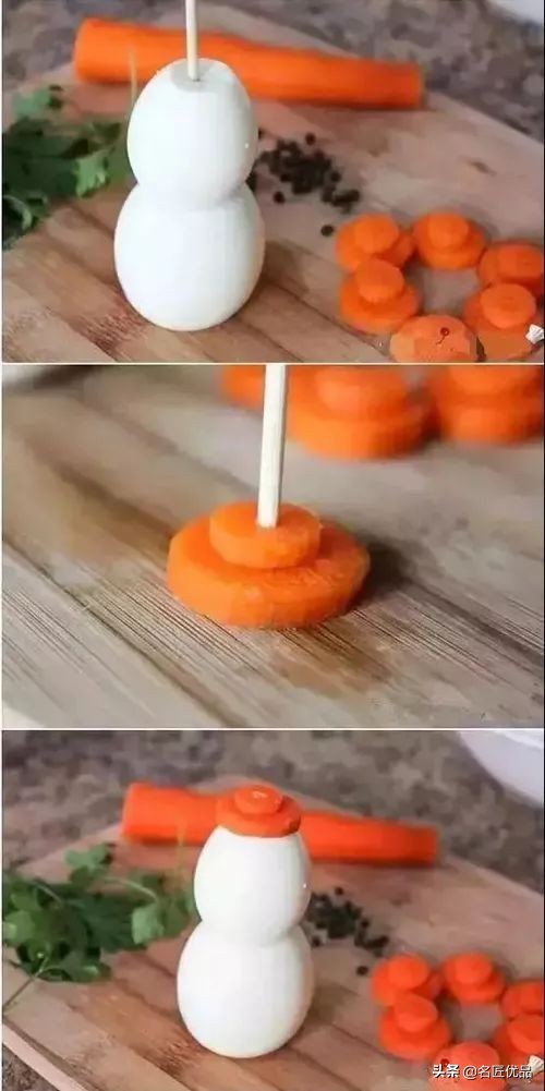 孩子的早餐也可以是萌萌哒小雪人!将两个剥了壳的鸡蛋与两个大小不同的圆形胡萝卜片用竹签相连,做成雪人的头部、身子和帽子;