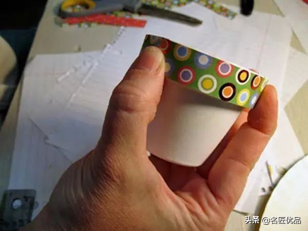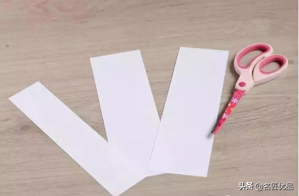 制作步骤:首先在白纸上裁剪出三条长短宽度大小一致的长条,并且分别将其固定成筒状,然后修剪成三个从小到大的大小