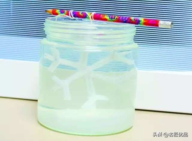 将雪花放入瓶中,让它不触碰到瓶子的周围和底部;浸泡约4小时,结晶完成