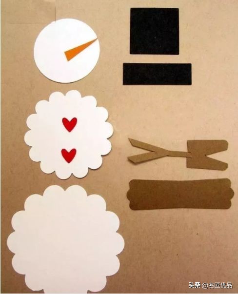 制作步骤:在白色卡纸上裁剪出一个圆以及两个像花朵一样的圆,大小逐渐变大,在橘色卡纸上剪成鼻子,红色卡纸上剪出扣子,黑色卡纸坚持帽子,褐色卡纸剪出树枝的形状