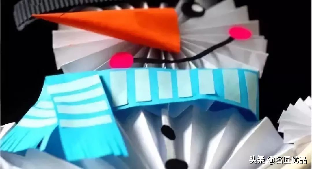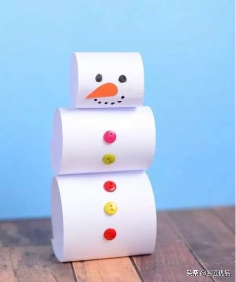 最后将所有这些部件用胶水粘合在一起,并画上眼睛、嘴巴、纽扣、腮红,一个雪人模型就制作完成了!