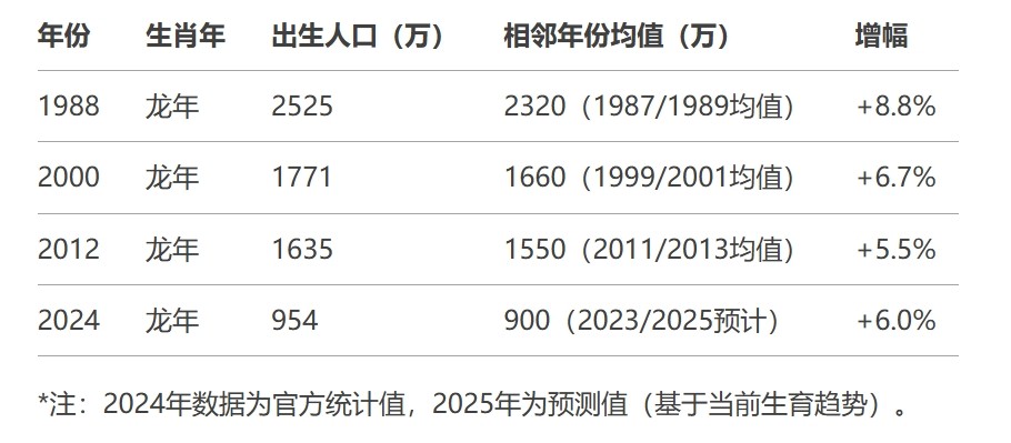 二是中国家庭对生肖"龙"的偏爱这个关键的短期因素。数据显示,龙年出生人口通常比相邻生肖年份高出5%-6%,2024年比2023年增长5.8%。事实上,较早之前,媒体就在有意渲染龙年生育高峰期的情绪。