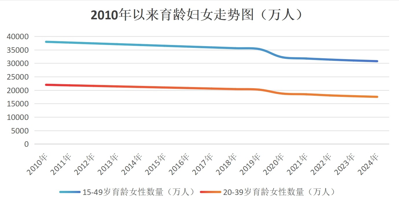 二则,不能忽略育龄妇女数量锐减这个重要的结构性因素:中国育龄妇女(15-49岁)数量从2011年高峰的3.8亿降至2023年的约3.2亿,年均减少约500万。2025年育龄妇女数量预计进一步降至约3亿,生育基础人口持续萎缩。
