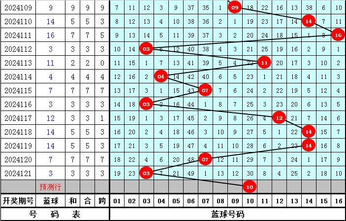 蓝球大小:近50期蓝球大小比为24:26,大小蓝球开出比例基本相当,近10期蓝球大小比为4:6,小 号蓝球活跃,本期注意大号蓝球10、11、12、16。