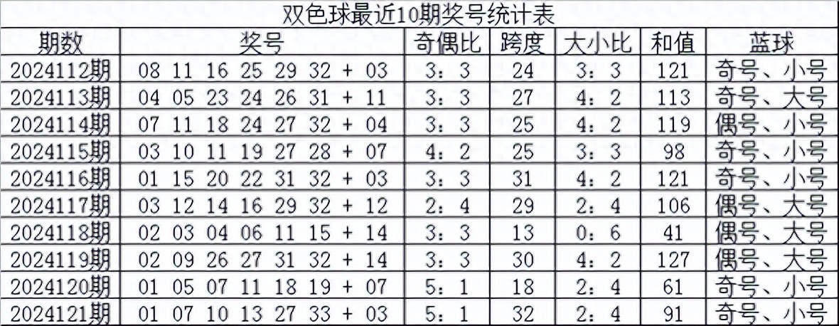双色球第2024121期奖号为:01、07、10、13、27、33+03。其中红球和值为91,奇偶比为5:1,大小比为2:4,蓝球开出奇数、小 号。