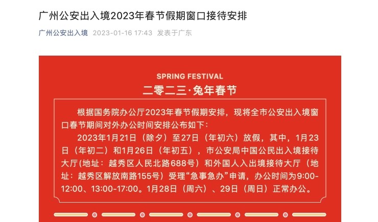 最新!2023年春节假期广州公安出入境窗口接待安排→