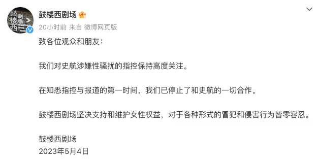 与此同时,单向街图书馆和鼓楼西剧场也相继发表声明,宣布将不再与史航有任何形式的合作。单向街图书馆在声明中提及受害者的存在,让人们对史航的所作所为产生了更多的质疑和好奇。而鼓楼西剧场与史航的关系匪浅,史航不仅是该公司的股东之一,还与公司的最终受益人李小丹及另一持股股东吴思聪有着紧密的商业合作。然而,在史航涉嫌性骚扰事件曝光后,鼓楼西剧场毅然决然地选择了与史航切割,这一举动无疑是对史航职业生涯的一次重大打击。