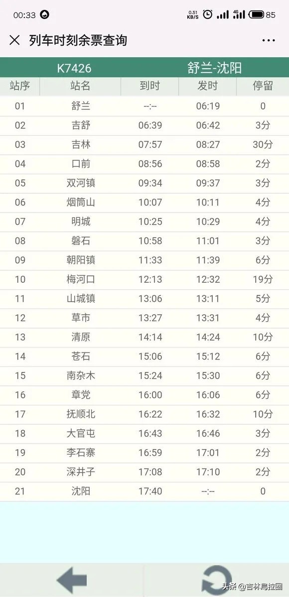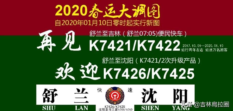 开行日期:2020年1月10日K7425次由沈阳、1月11日K7426由舒兰