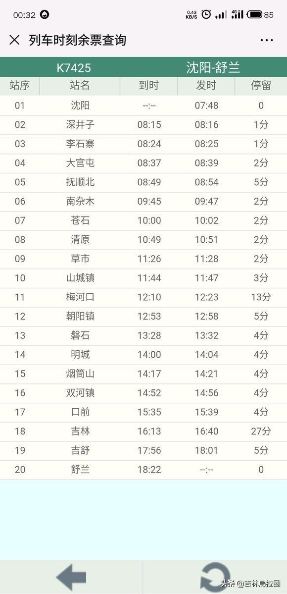 经停站:K7425 沈阳07:48、深井子、李石寨、大官屯、抚顺北、南杂木、苍石、清原、草市、山城镇、梅河口、朝阳镇、磐石、明城、烟筒山、双河镇、口前、吉林16:13/16:40开、吉舒17:56/18:01开、舒兰终到18:22(吉林至舒兰间运行时间按吉林至舒兰原K7421次执行)