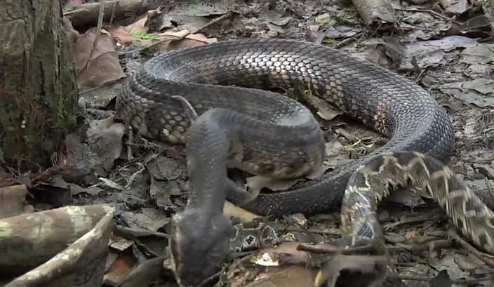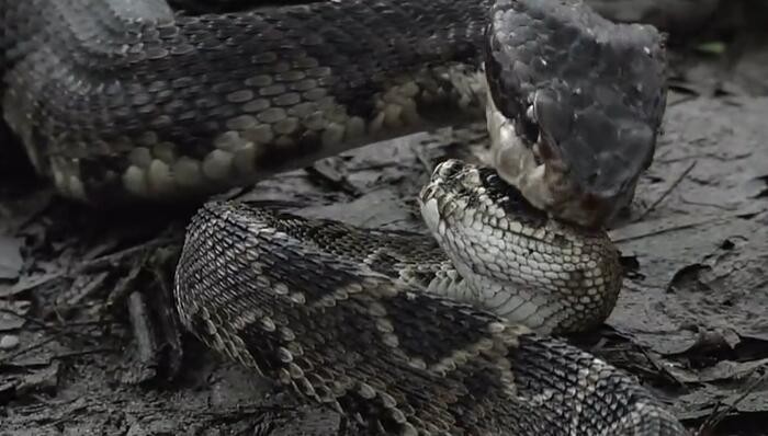 水腹蛇残忍撕咬活吞响尾蛇,而响尾蛇竟然呆呆地躺着做这事!