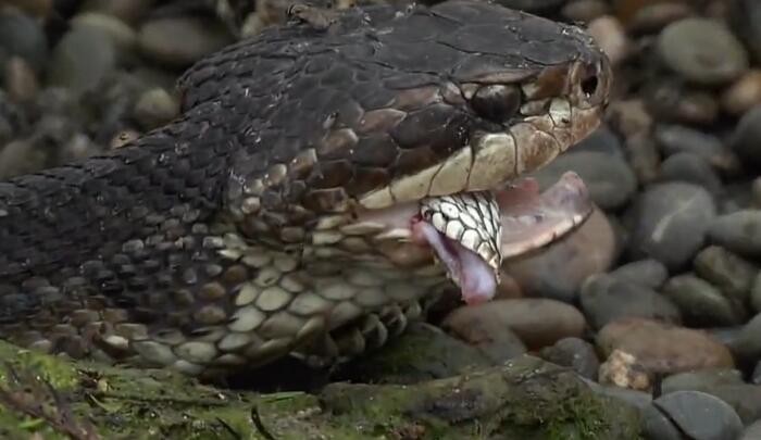 但没想到,下一步,水腹蛇一口,就咬住了响尾蛇的头部!