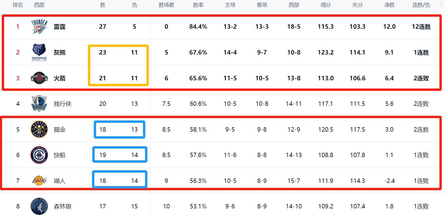 NBA西部排名!灰熊第2和火箭拉开差距,快船和湖人送掘金大礼进5
