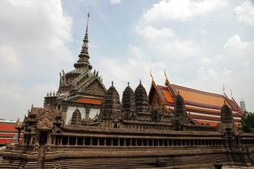 建于1784年的玉佛寺是泰国大王宫的一部分,面积约占大王宫的1/4。玉佛寺是泰国王族供奉玉佛像和举行宗教仪式的场所,因寺内供奉着玉佛而得名。寺内四周有长约一公里的壁画长廊,上面绘有178幅以印度古典文学《罗摩衍那》史诗为题材的精美彩色连环画,并附有泰文译诗。玉佛寺内的几块大瓷屏风上彩绘着中国《三国演义》的故事,精美绝伦。