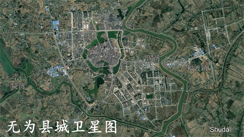 我们继续将视角下降至巢湖市区上空25公里处,此时我们已经可以看到巢湖市区的全貌了。现在我们看到的县级巢湖市区的前身就是地级巢湖市的市区居巢区。地级巢湖市管辖一区四县,分别是居巢区、无为县、庐江县、和县和含山县,总面积9423平方公里。