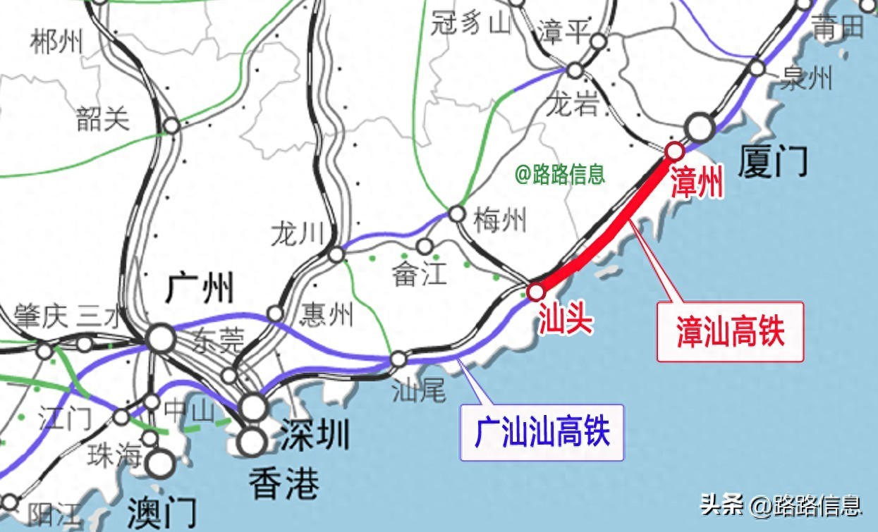 漳汕高铁于2月4日在漳州和汕头两地同时举行了开工仪式,漳汕高铁也成为闽粤两省2024年首个开工设计时速为350km的重点轨道交通工程项目,线路全长约176公里,项目总投资约401亿元,其中广东段总投资约134亿元,计划工期4年半,预计2028年建成通车。漳汕高铁地理位置示意图如下: