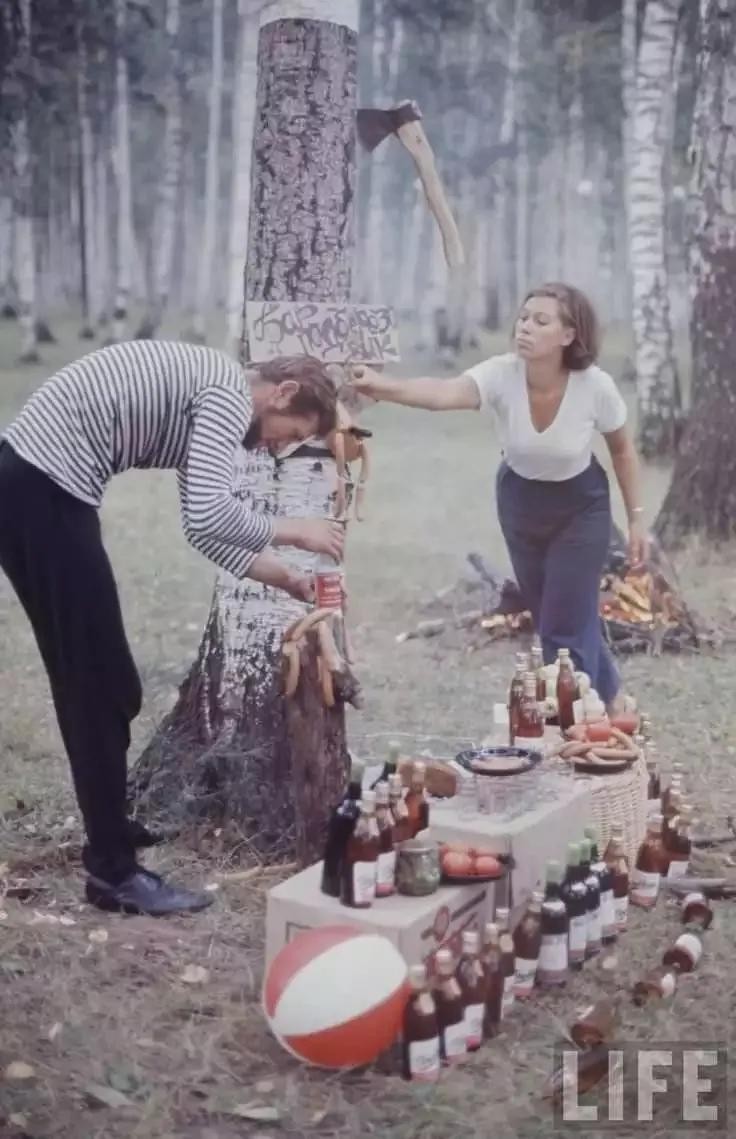 1964年,俄罗斯一对夫妇在野餐,树上还挂有热狗。当时这样的人被称为“苏联嬉皮士”