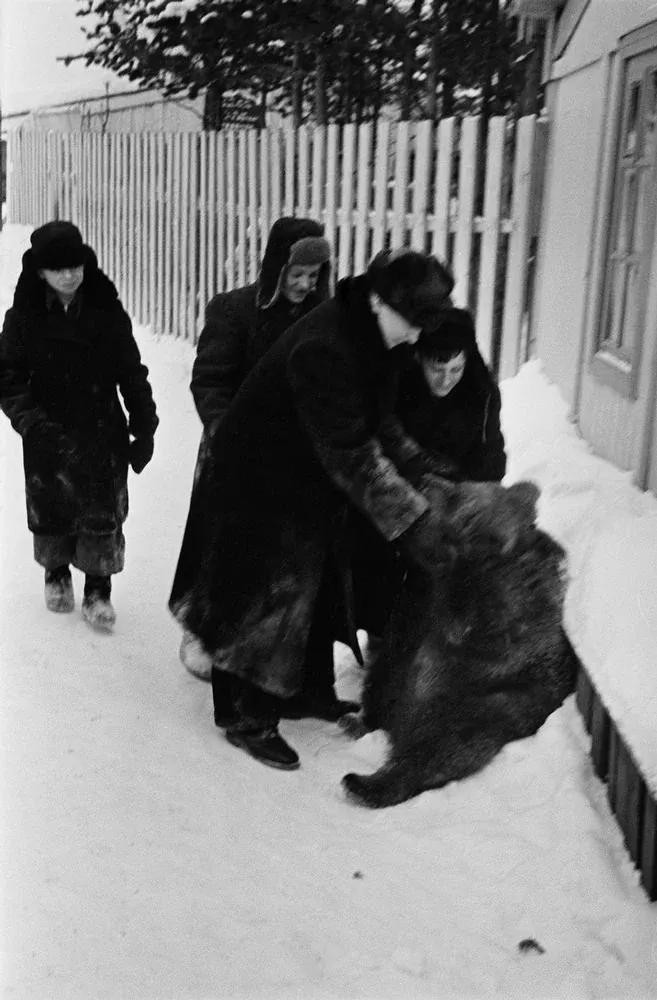 1954年在苏联,几个孩子们在和熊玩耍