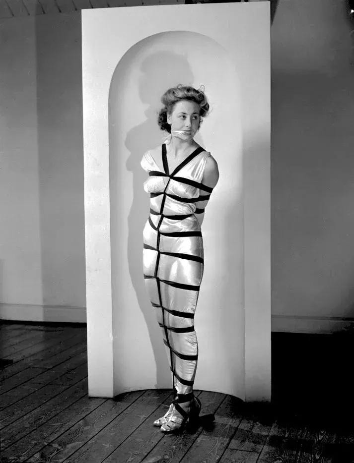 1949年在英格兰纽卡斯尔,一名模特拍摄照片时看起来很不舒服