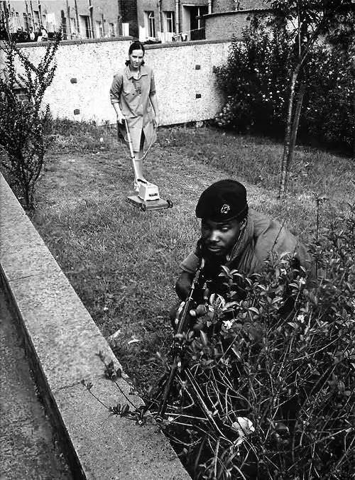1973年,英国士兵在北爱尔兰作战,一名女子完全无视,自顾自割草