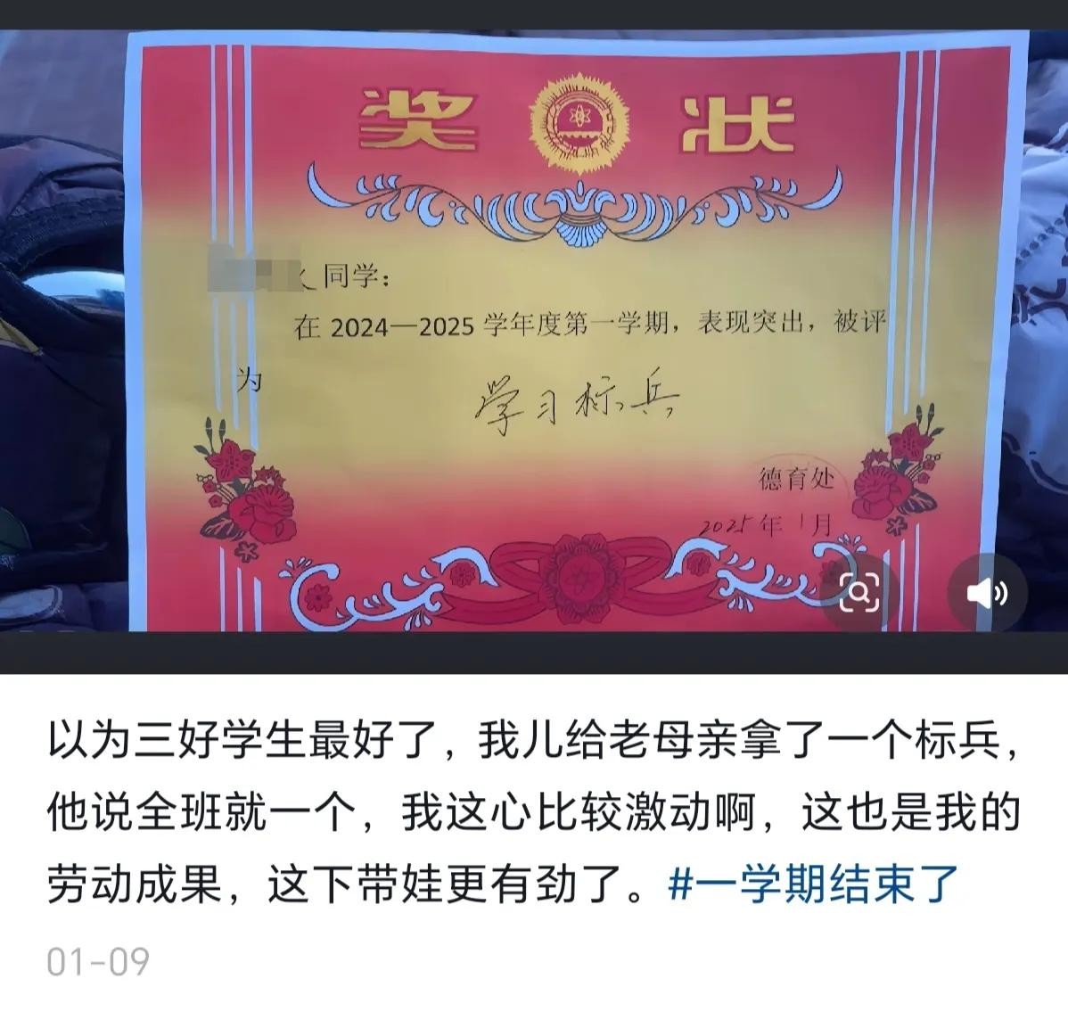 这位家长说,以为“三好学生”荣誉最好,结果儿子得到了“学习标兵”的称号,且全班只有一个“学习标兵”,于是内心特别激动。