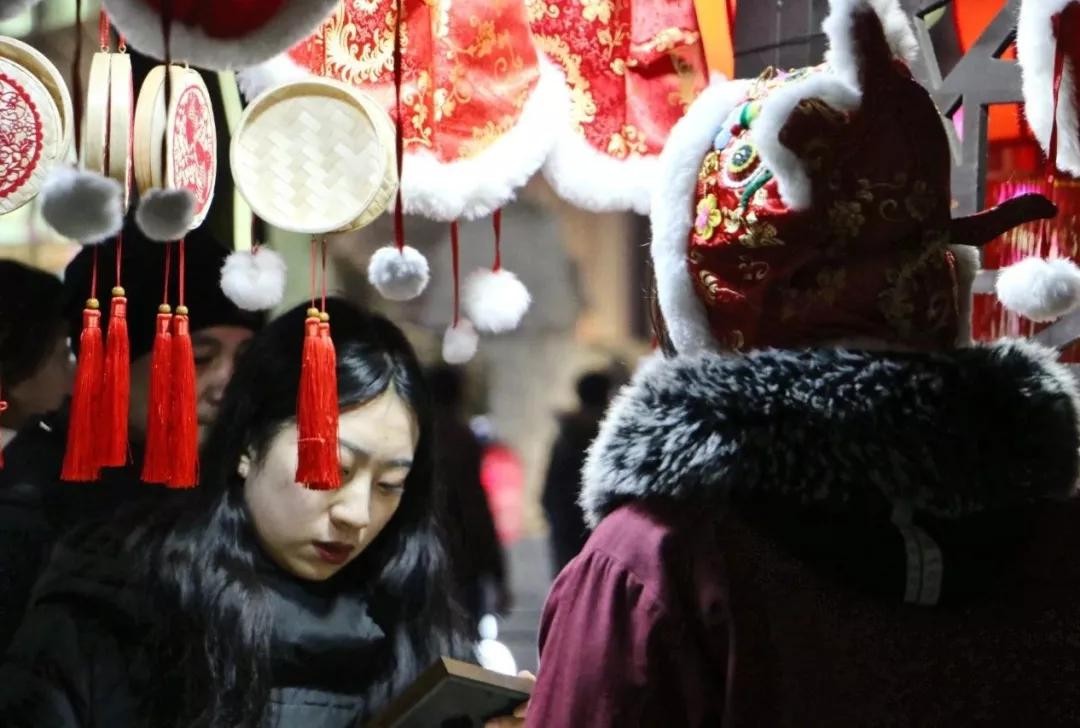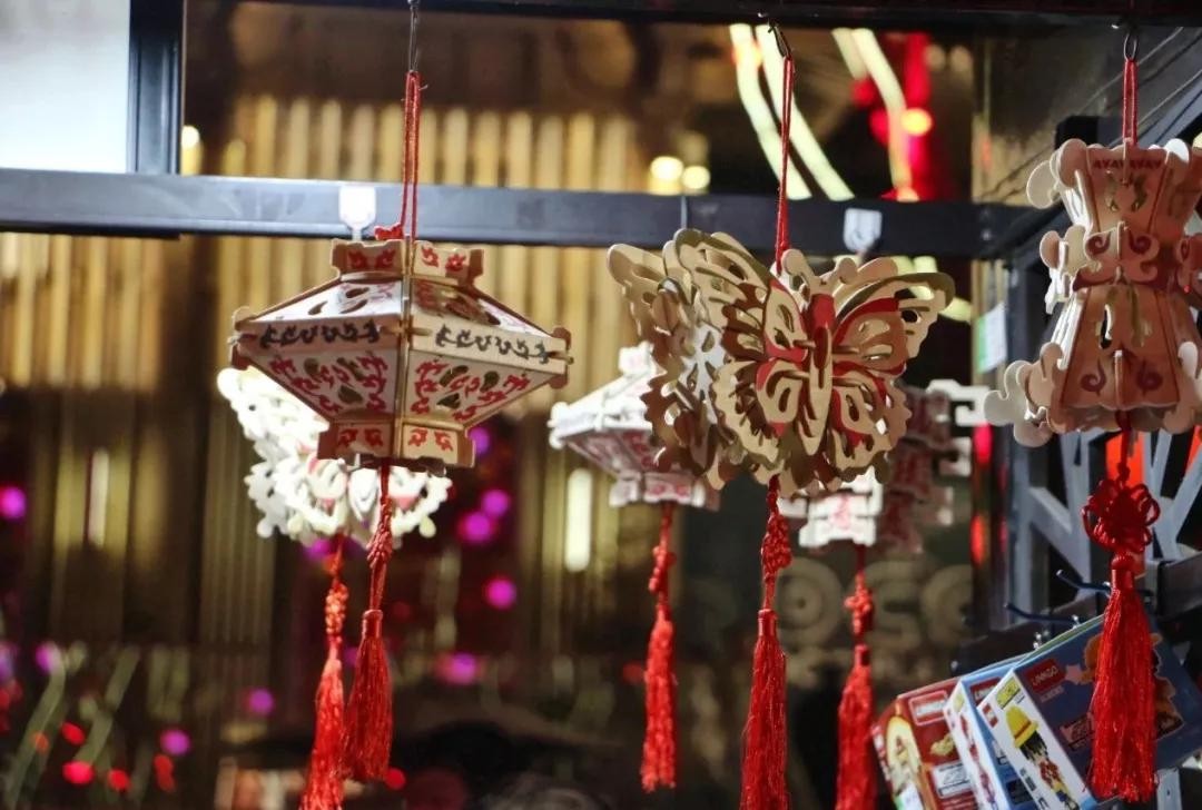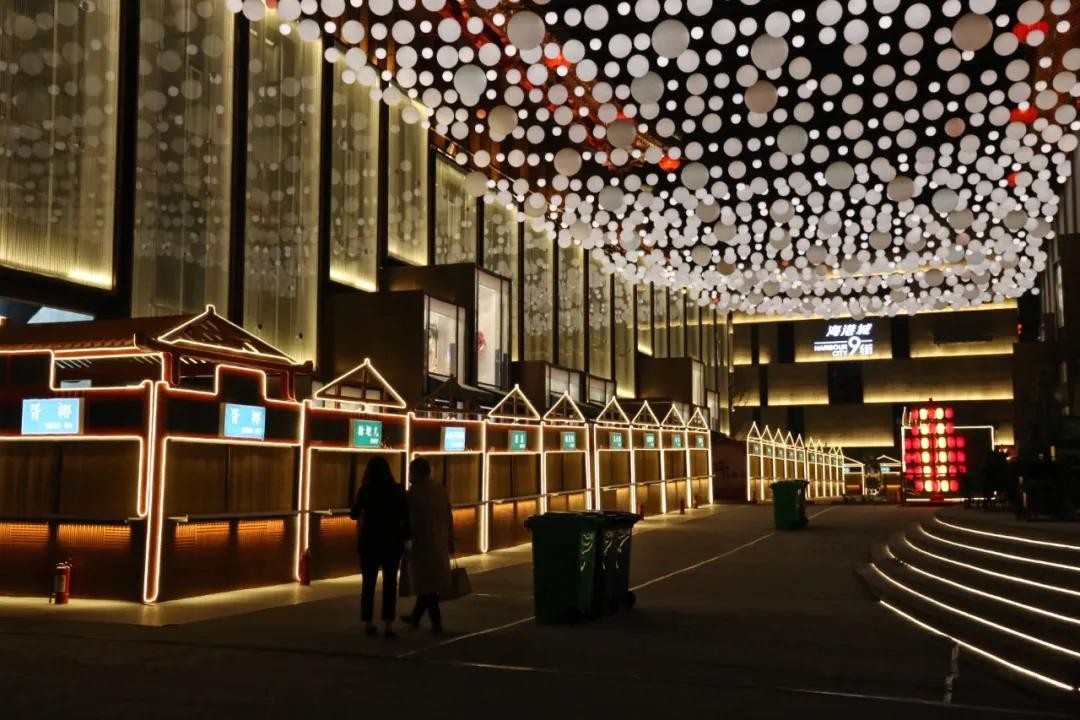 景观街上不光有各种巨型天灯引人驻足,隔三差五还能看到路旁的精致摆设,几串灯火、几家小铺,精致用心。