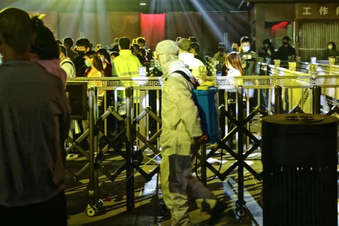 所有观众要求流动观看,进入S通道时需要出示绿码并测量体温,时不时还有喷洒消毒水的工作人员在人群中进行消杀。